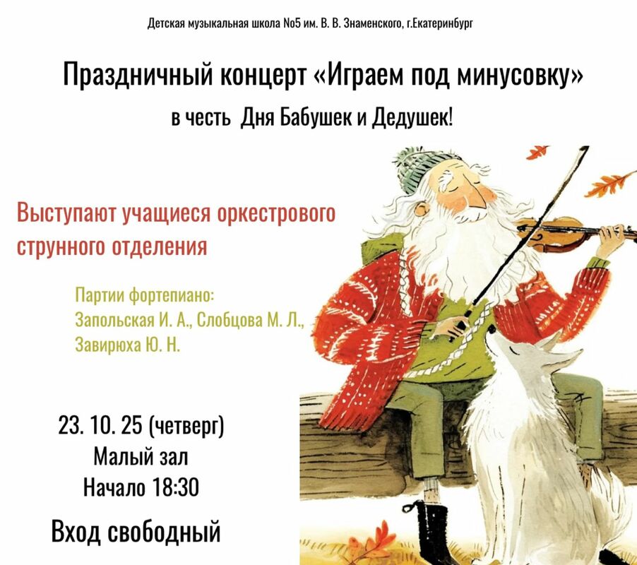 23 октября (четверг) в Малом зале ДМШ 5 им. В. В. Знаменского состоится праздничный концерт «Играем под минусовку» в честь Дня Бабушек и Дедушек!