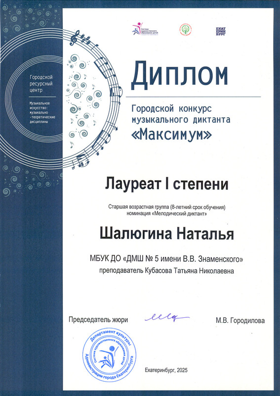 30.10.25 Творческие достижения: Ученики: Шалюгина Наталья. Городской конкурс музыкального диктанта «Максимум», номинация..