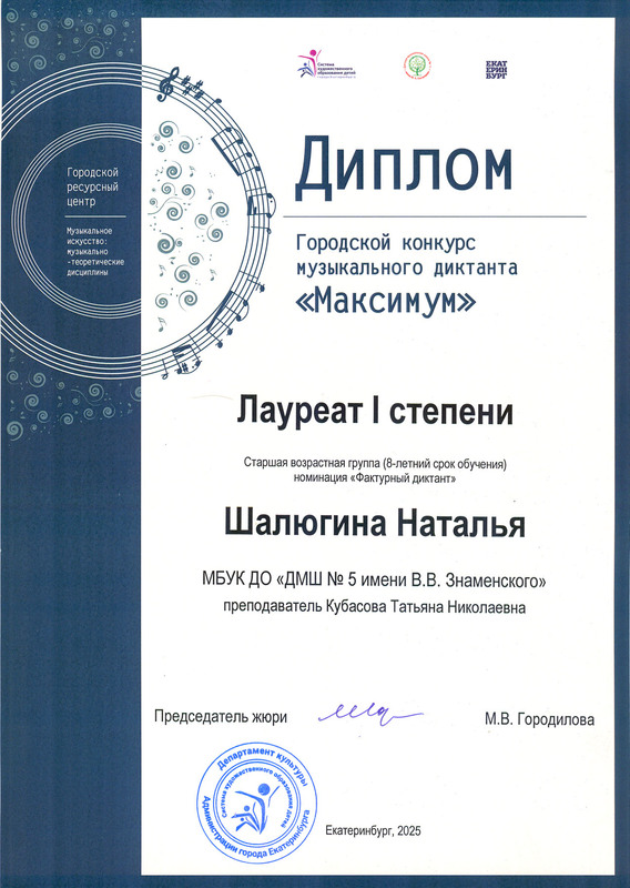 30.10.25 Творческие достижения: Ученики: Шалюгина Наталья. Городской конкурс музыкального диктанта «Максимум», номинация..
