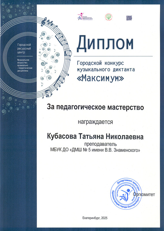 30.10.25 Творческие достижения: Преподаватели: Кубасова Татьяна Николаевна. Городской конкурс музыкального диктанта «Максимум»...