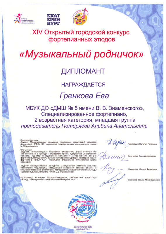 XIV Открытый городской конкурс этюдов по специализированному и общему фортепиано "Музыкальный родничок". 22.11.2025 г.
