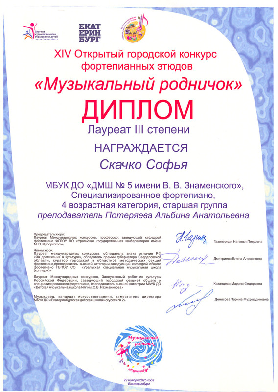 XIV Открытый городской конкурс этюдов по специализированному и общему фортепиано "Музыкальный родничок". 22.11.2025 г.