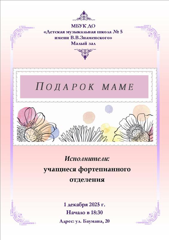 1 декабря (пн) в Малом зале ДМШ № 5 им. В. В. Знаменского состоится концерт фортепианного отделения "Подарок Маме".