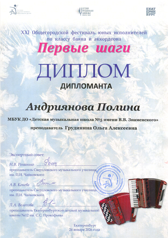 XXI Общегородской фестиваль юных исполнителей по классу баяна и аккордеона «Первые шаги». 24.01.2026 г.
