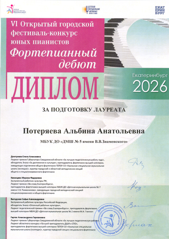 03.04.26 Творческие достижения: Преподаватели: Потеряева Альбина Анатольевна. VI Открытый городской фестиваль-конкурс юных пианистов..