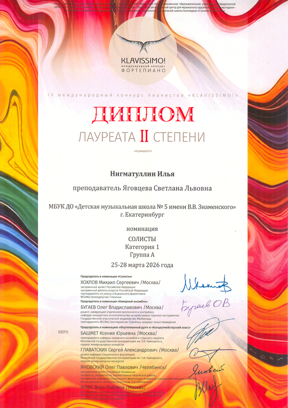 06.04.26 Творческие достижения: Ученики: Нигматуллин Илья. IV Международный конкурс пианистов "Klavissimo!". 27.03.2026 г...