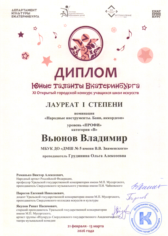 XI Открытый городской конкурс учащихся школ искусств "Юные таланты Екатеринбурга", уровень "профи". 07.03.2026 г.