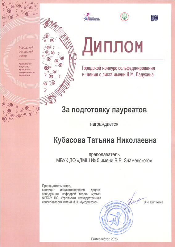 08.04.26 Творческие достижения: Преподаватели: Кубасова Татьяна Николаевна. Городской конкурс сольфеджирования и чтения с листа имени Н.М.Ладухина...