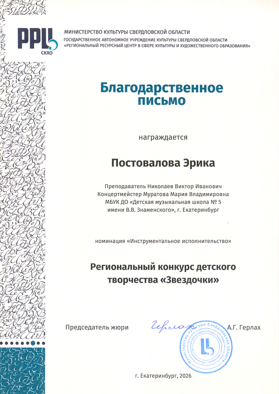 24.04.26 Творческие достижения: Ученики: Постовалова Эрика. Региональный конкурс детского творчества "Звездочки". 01.03.2026 г...